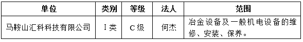 根据《上海市设备维修安装企业能力等级分类办法》(沪设协【2018】2号),经上海市设备管理协会维修市场管理办公室审核,对马鞍山汇科科技有限公司拟核发《上海市设备维修安装企业能力等级证》,为保证审核工作的公正性,增加工作的透明度,现将该企业拟获证的类别、等级及业务开展范围等予以公示,以广泛接受社会监督。公示时间为:2025年8月27日至9月2日,如有不同意见,请在公示期间以书面形式将反映的情况寄(送)至上海市设备管理协会(邮寄的材料以到达日邮戳为准)。单位反映情况需加盖公章,个人反映情况需签署真实姓名,并留下真实的联系电话、地址和邮政编码。