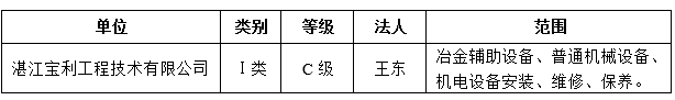 根据《上海市设备维修安装企业能力等级分类办法》(沪设协【2018】2号),经上海市设备管理协会维修市场管理办公室审核,对湛江宝利工程技术有限公司拟核发《上海市设备维修安装企业能力等级证》,为保证审核工作的公正性,增加工作的透明度,现将该企业拟获证的类别、等级及业务开展范围等予以公示,以广泛接受社会监督。公示时间为:2025年10月09日14日,如有不同意见,请在公示期间以书面形式将反映的情况寄(送)至上海市设备管理协会(邮寄的材料以到达日邮戳为准)。单位反映情况需加盖公章,个人反映情况需签署真实姓名,并留下真实的联系电话、地址和邮政编码。