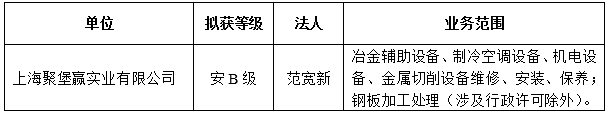 根据《上海市设备维修安装企业安全生产合格证等级评定办法》(沪设协(2018)5号),经上海市设备管理协会维修市场管理办公室评定,对上海聚堡赢实业有限公司拟核发《上海市设备维修安装市场安全生产合格证》,为保证评定工作的公正性,增加工作的透明度,现将该企业拟获合格证的等级和业务开展范围等予以公示,以广泛接受社会监督。公示时间为:2025年12月25日至31日,如有不同意见,请在公示期间以书面形式将反映的情况寄(送)至上海市设备管理协会(邮寄的材料以到达日邮戳为准)。单位反映情况需加盖公章,个人反映情况需签署真实姓名,并留下真实的联系电话、地址和邮政编码。