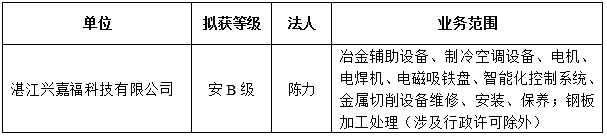 根据《上海市设备维修安装企业安全生产合格证等级评定办法》(沪设协(2018)5号),经上海市设备管理协会维修市场管理办公室评定,对湛江兴嘉福科技有限公司拟核发《上海市设备维修安装市场安全生产合格证》,为保证评定工作的公正性,增加工作的透明度,现将该企业拟获合格证的等级和业务开展范围等予以公示,以广泛接受社会监督。公示时间为:2026年1月26日至30日,如有不同意见,请在公示期间以书面形式将反映的情况寄(送)至上海市设备管理协会(邮寄的材料以到达日邮戳为准)。单位反映情况需加盖公章,个人反映情况需签署真实姓名,并留下真实的联系电话、地址和邮政编码。