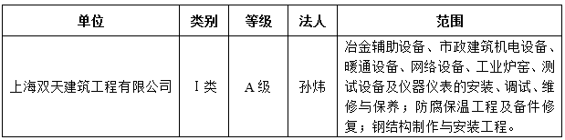 根据《上海市设备维修安装企业能力等级分类办法》(沪设协【2018】2号),经上海市设备管理协会维修市场管理办公室审核,对上海双天建筑工程有限公司拟核发《上海市设备维修安装企业能力等级证》,为保证审核工作的公正性,增加工作的透明度,现将该企业拟获证的类别、等级及业务开展范围等予以公示,以广泛接受社会监督。公示时间为:2026年2月3日至9日,如有不同意见,请在公示期间以书面形式将反映的情况寄(送)至上海市设备管理协会(邮寄的材料以到达日邮戳为准)。单位反映情况需加盖公章,个人反映情况需签署真实姓名,并留下真实的联系电话、地址和邮政编码。