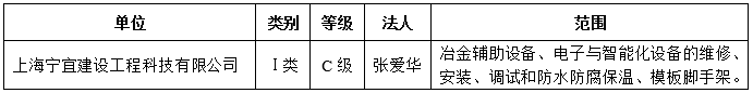 根据《上海市设备维修安装企业能力等级分类办法》(沪设协【2018】2号),经上海市设备管理协会维修市场管理办公室审核,对上海宁宜建设工程科技有限公司拟核发《上海市设备维修安装企业能力等级证》,为保证审核工作的公正性,增加工作的透明度,现将该企业拟获证的类别、等级及业务开展范围等予以公示,以广泛接受社会监督。公示时间为:2026年3月10日至16日,如有不同意见,请在公示期间以书面形式将反映的情况寄(送)至上海市设备管理协会(邮寄的材料以到达日邮戳为准)。单位反映情况需加盖公章,个人反映情况需签署真实姓名,并留下真实的联系电话、地址和邮政编码。